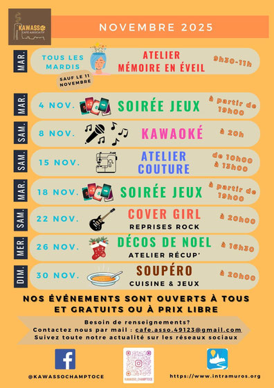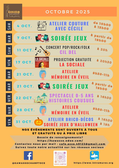 Au programme : soirée jeux deux fois par mois, atelier couture une fois par mois, atelier théâtre une fois par mois, concerts réguliers, tournois de palet, rencontre thématique et autres événements !